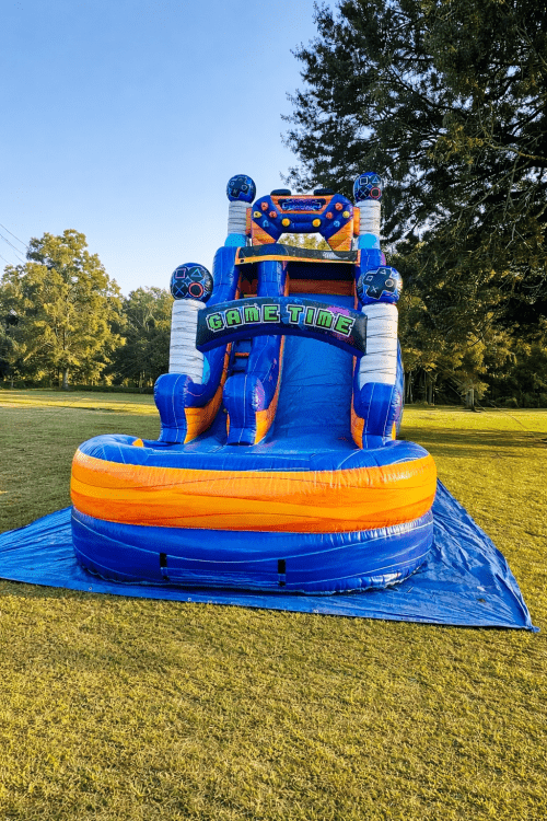 We deliver bounce house rentals and water slide rentals to Dayton TX, Liberty TX, Crosby TX, Mont Belvieu TX, and surrounding areas. Our 18ft Gamer water slide and inflatable party rentals are delivered on time and set up safely (delivery fees calculated at checkout).
