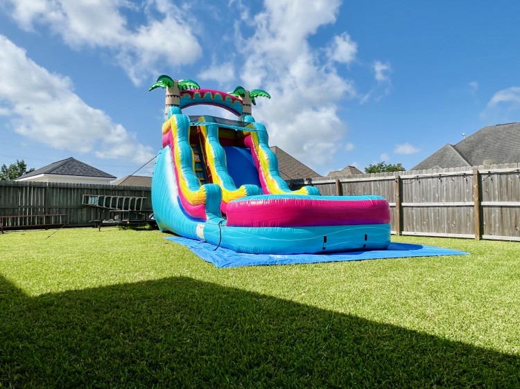 We deliver bounce house rentals and water slide rentals to Dayton TX, Liberty TX, Crosby TX, Mont Belvieu TX, and surrounding areas. Our 18ft Paradise water slide and inflatable party rentals are delivered on time and set up safely (delivery fees calculated at checkout).